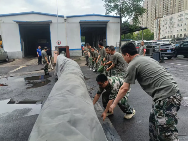 本次演練模擬因受持續(xù)強降雨影響,導致公司西院積水嚴重,修理廠設(shè)施設備麵臨水(shuǐ)淹風險的場景。公司防汛指揮領導小組迅速啟動防汛應(yīng)急響應,20名防汛應急搶險隊員迅速集結,按照預案分工展開行動。應(yīng)急搶險隊員第一時間奔赴現場,利用修理廠電動柵欄門為支撐(chēng),在上麵鋪設防(fáng)水雨布,再用沙袋將雨布壓實固定築起防水堤,防止積水繼續向修理廠院內倒灌(guàn);同步開展排水管線鋪設作業,快速搭建應急排(pái)水設施,將(jiāng)修理廠院內積水排出。